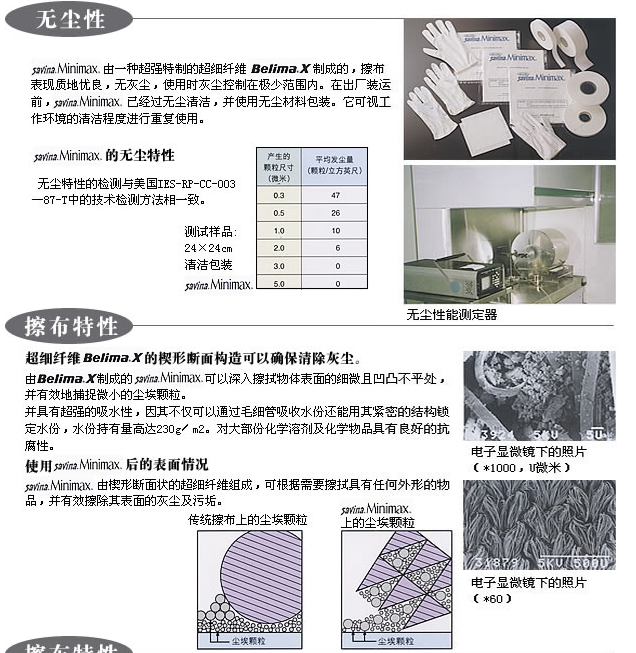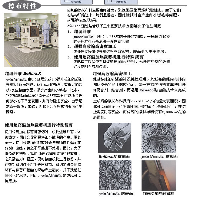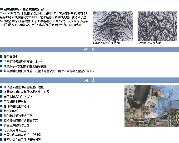 日本savina無塵布高科技領(lǐng)域正日益精密和復(fù)雜。對于LSI和LCD等產(chǎn)品生產(chǎn)過程中所需的嚴(yán)格無塵環(huán)境而言,高效擦拭布是必備要素。Savina MINIMAX能夠輕松滿足時(shí)代需求,具有出色的功能,足以應(yīng)對超級無塵室中的極端無塵條件。